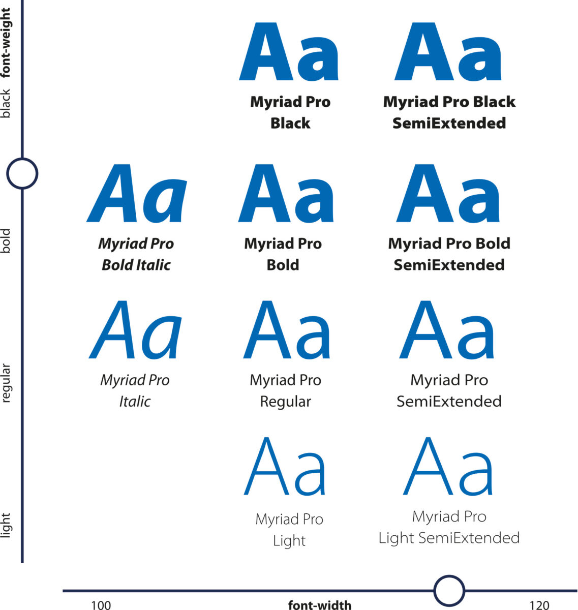 Die Myriad Pro ist eine in Schriftstärke und -breite stufenlos verstellbare Schrift. Diese besondere Eigenschaft schafft die Grundlage für den flexiblen Einsatz. Je nach Anforderung, Kontext oder Aussage einer Anwendung kann die Typografie angepasst werden. Beispielsweise ist die Myriad Pro in der digitalen Anwendung durch eine flexible Schriftweite sehr platzsparend, da sie die Möglichkeit bietet, sich an der Breite des sichtbaren Bereichs (dem Viewport) zu orientieren. Lesbarkeit sowie Kontraste können durch eine Anpassung der Schriftstärke verbessert werden und in Animationen öffnet die Myriad Pro gestalterische Freiheiten.