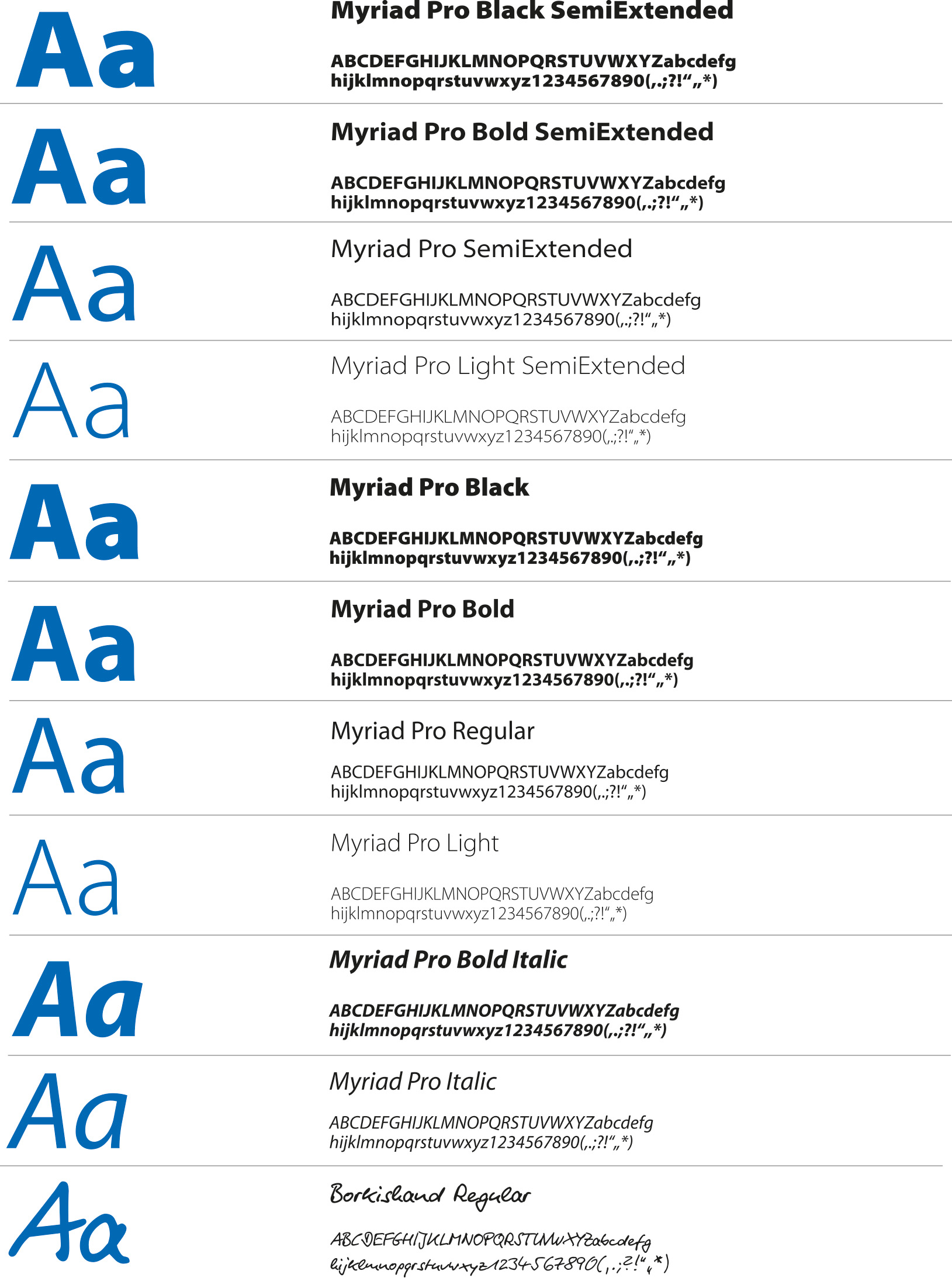 Der Schriftschnitt Myriad Pro Black SemiExtended wird für große Hauptüberschriften verwendet. Der Schriftschnitt black ist nur als Semi Extended anzuwenden. Die Schriftstärken (Light, Normal bis Bold) dagegen sind frei wählbar – passend zur Aussage.